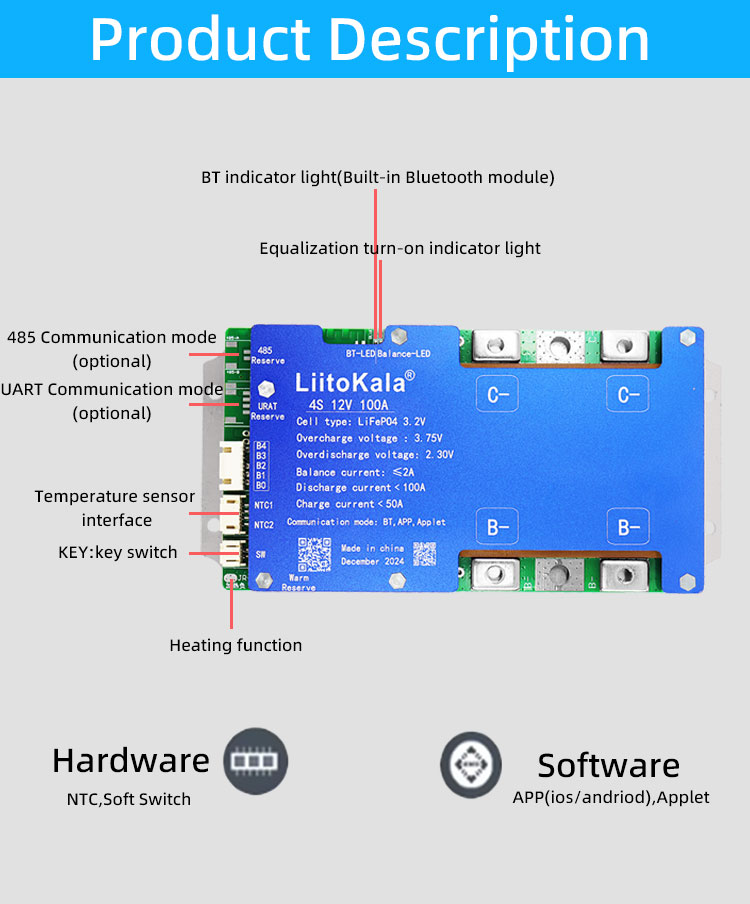 LiitoKala Bluetooth 4S-12V100A Smart BMS Lifepo4 With Car Starting Power Uart Series Heat Passive Balance Function Built-in Bluetooth BMS
