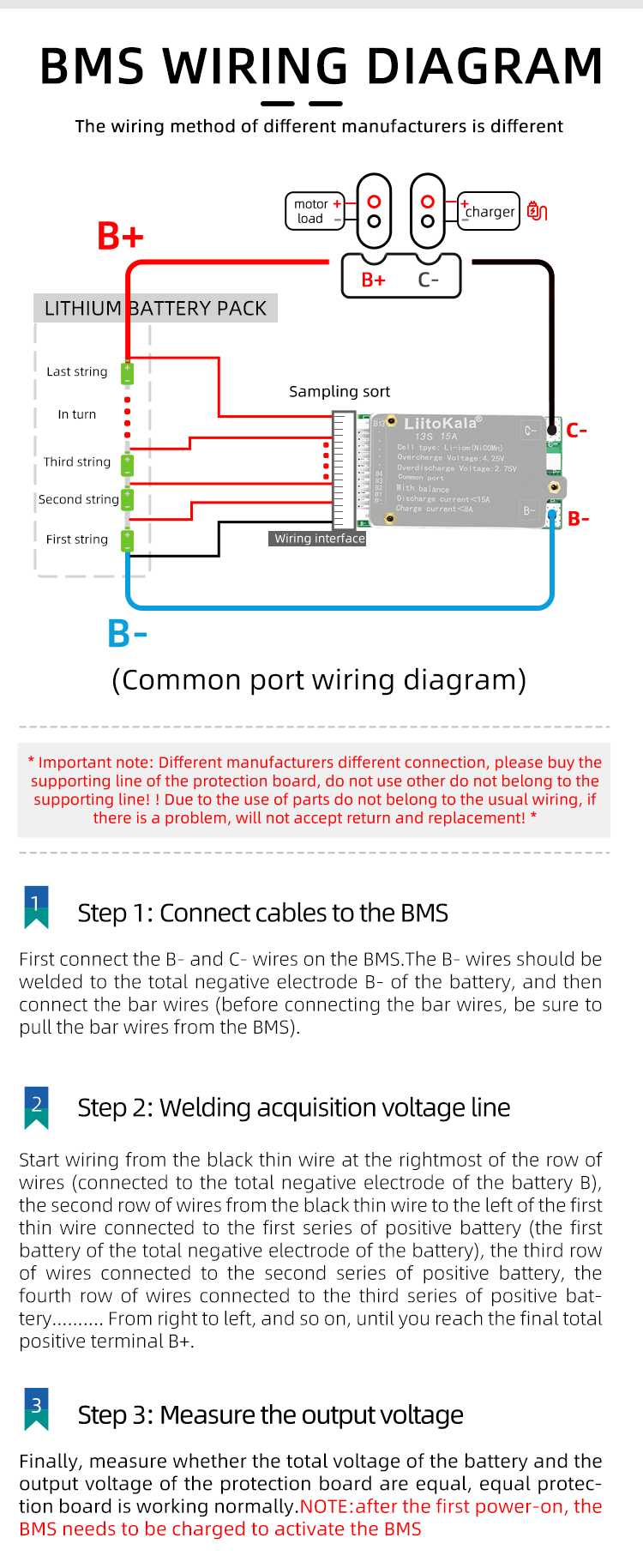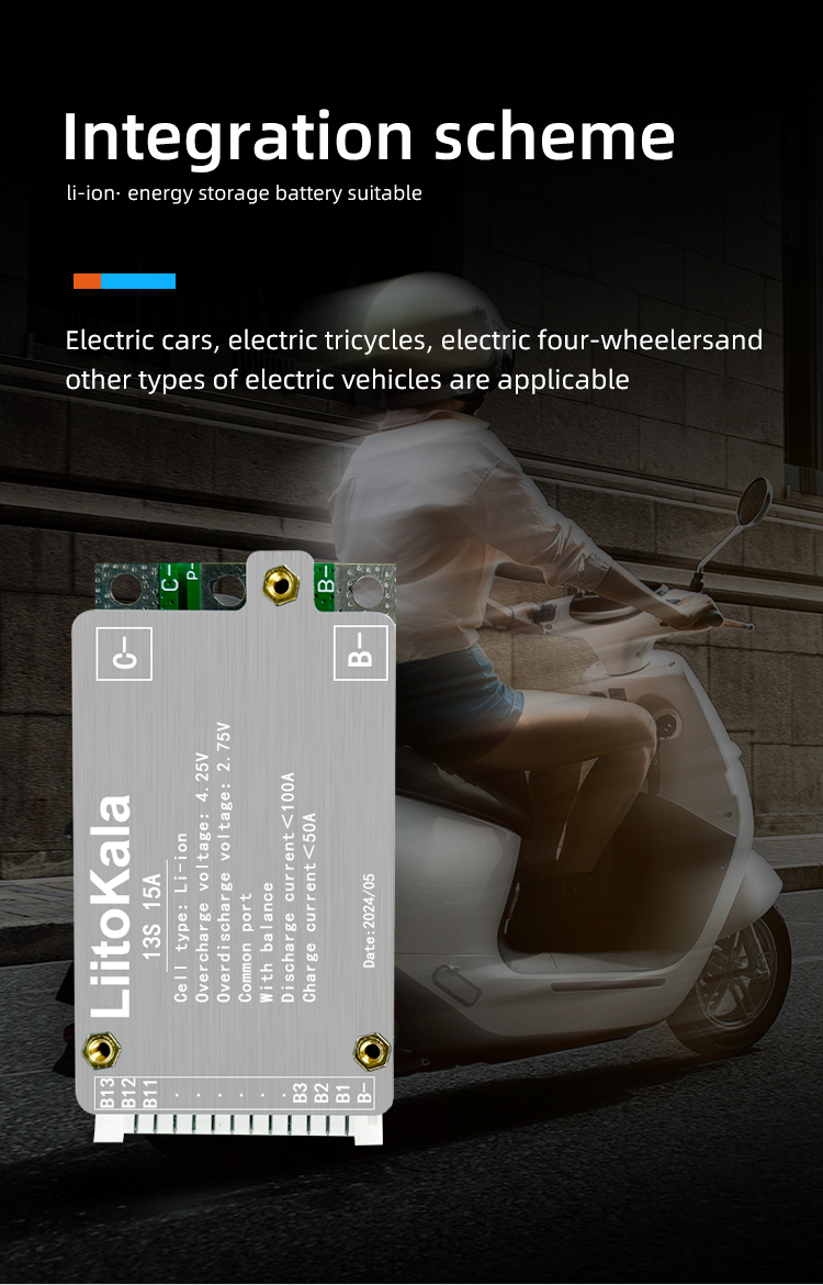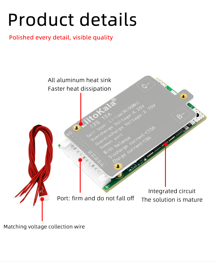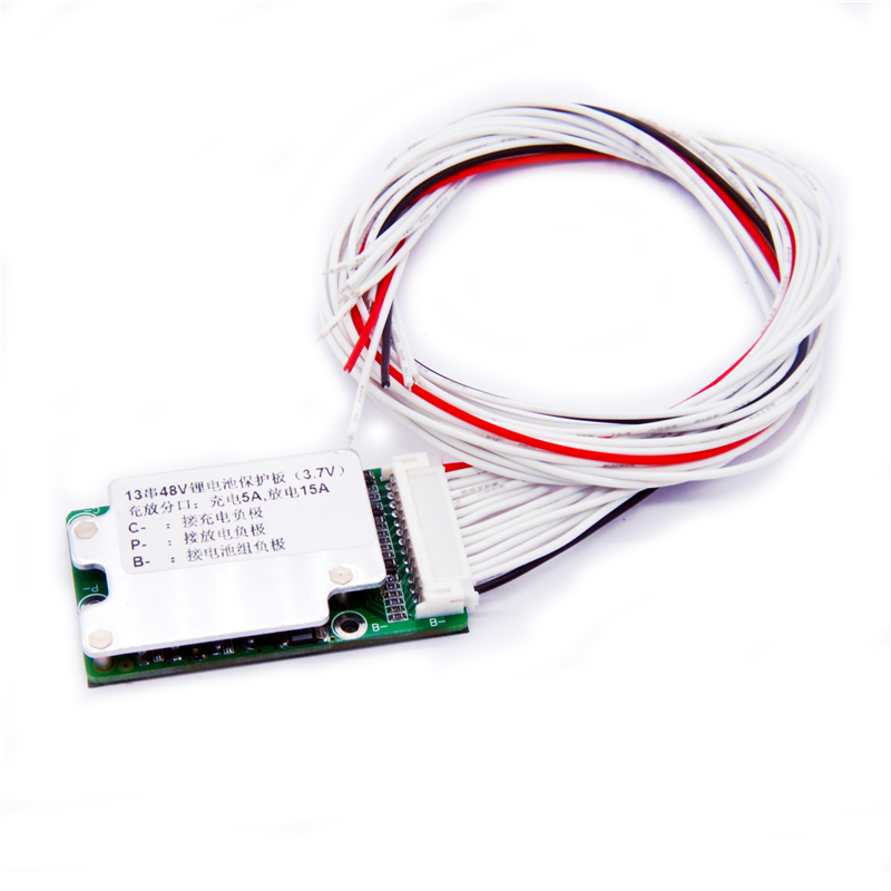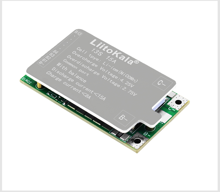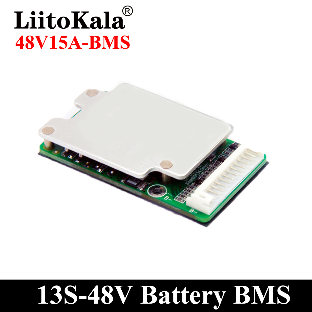 Brand:LiitoKalaModel:13S-48V15A-BMSDetection voltage: 54.6V±15MVDischarge current: <15ACharging current: <5ASize:60*33*10±1MM 50g