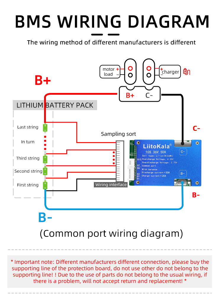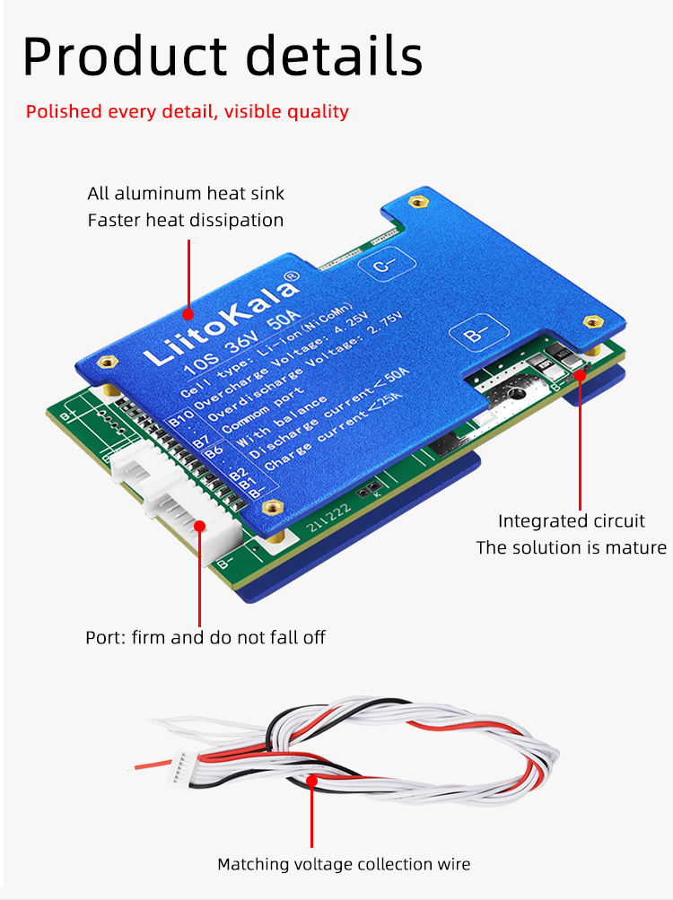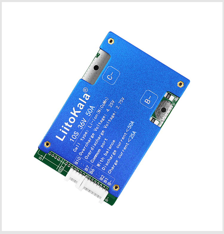 Brand:LiitoKalaModel:10S-36V50A-BMSDetection voltage: 42V±15MVDischarge current: <50ACharging current: <25ASize:86.5*55*10±1MM 115g