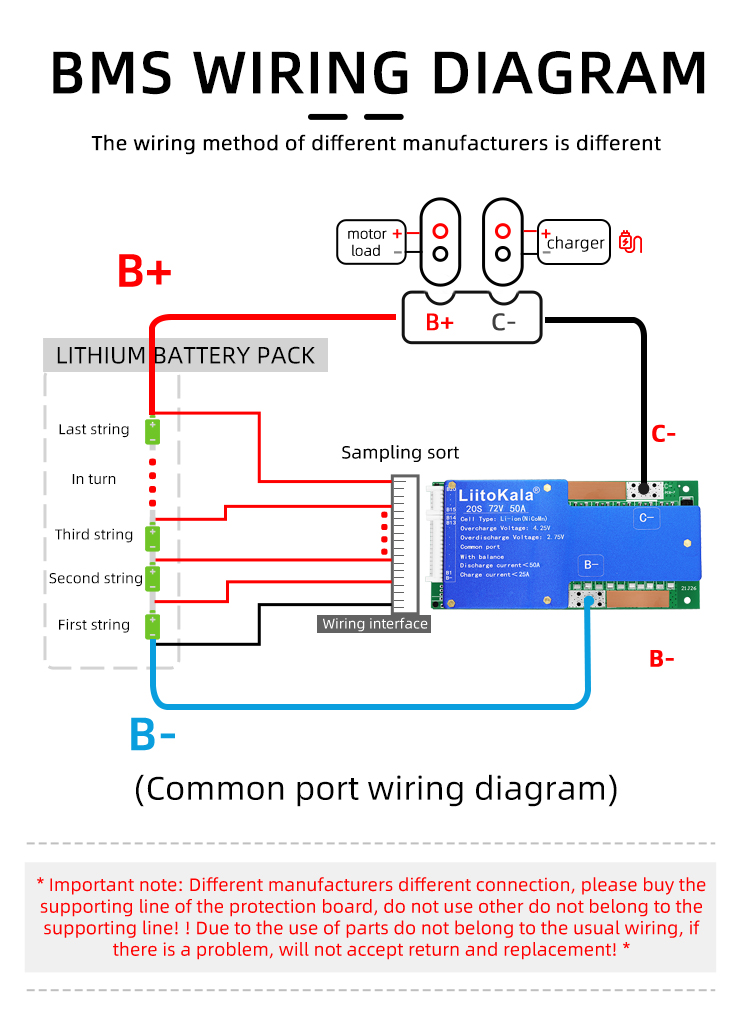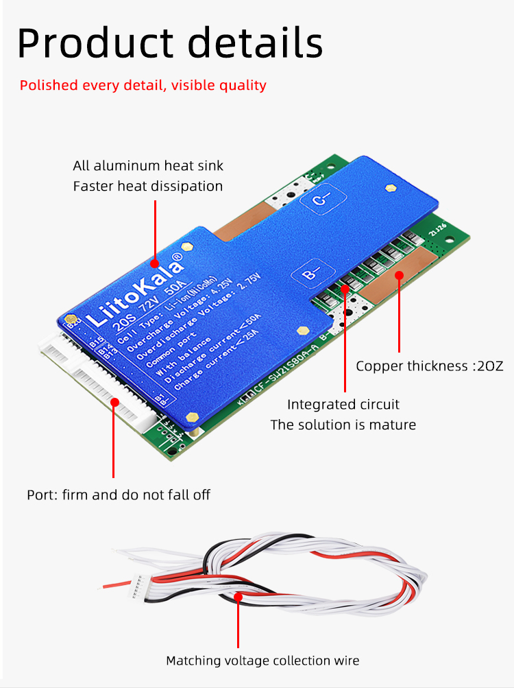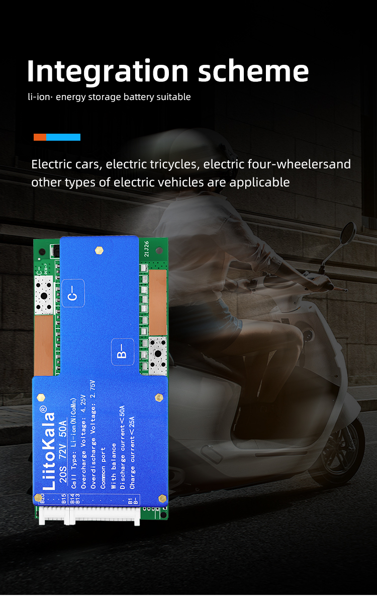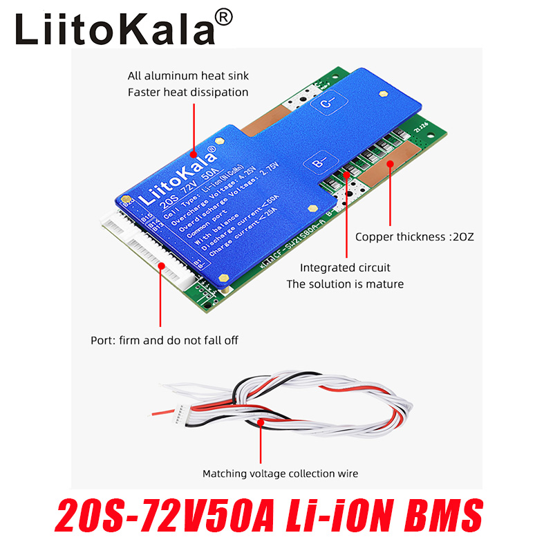 Brand:LiitoKalaModel:20S-72V50A-BMSDetection voltage: 84V±15MVDischarge current: <50ACharging current: <25A