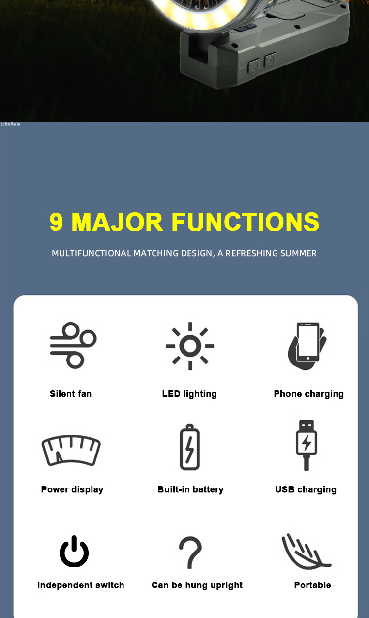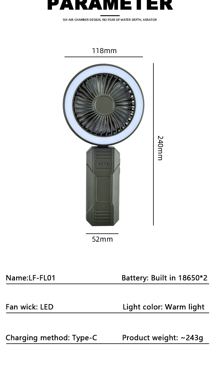 LiitoKalaName: LF-FL01Core: LEDFan: Silentcharge: Type-CBattery: Built in 18650 * 2Light color: Warm lightWeight:~ 243gLED lightingphone chargingPower display