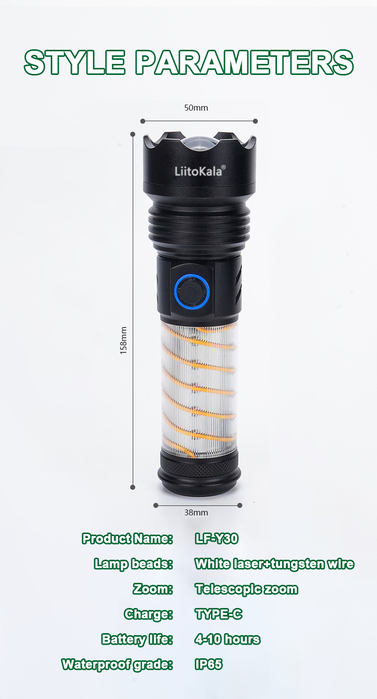 LiitoKalaModel: LF-Y30Product name: Camping lamp flashlightLamp bead: white laser+tungsten wireZoom: No zoomcharge: TYPE-CBattery life: 4-10 hoursWaterproof grade: IP65