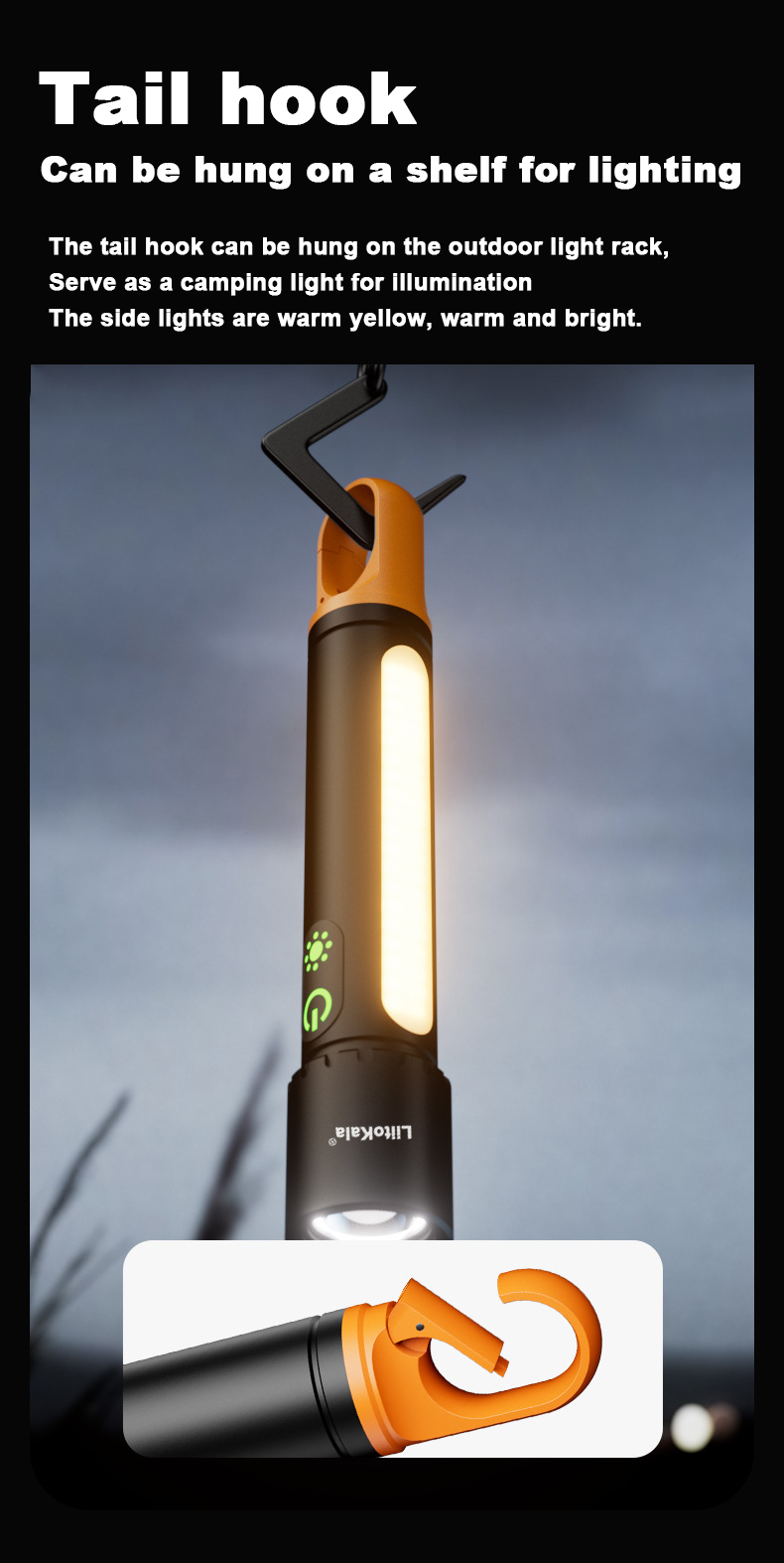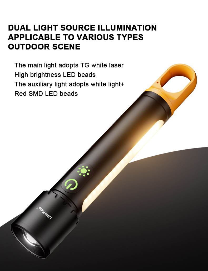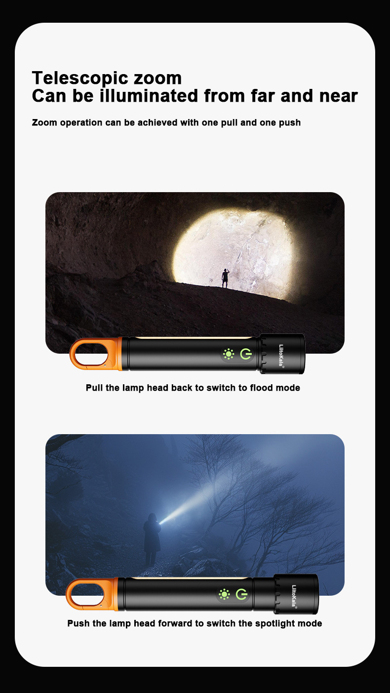 Features: Dual light source illumination/telescopic zoom/bidirectional charging/portable hook