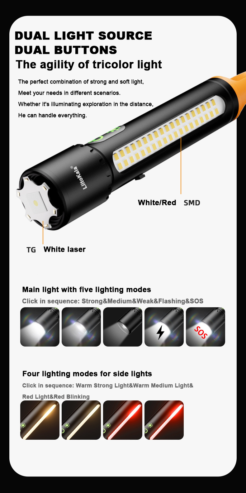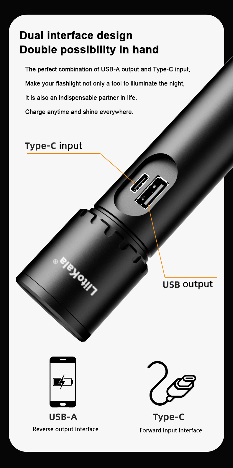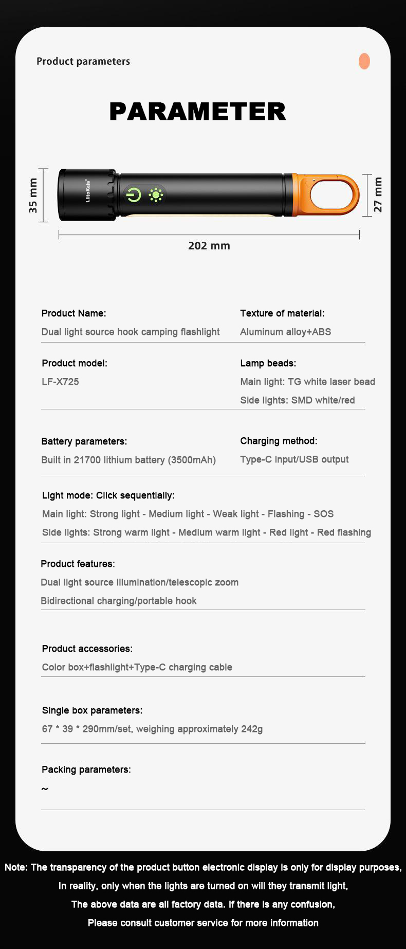Features: Dual light source illumination/telescopic zoom/bidirectional charging/portable hook