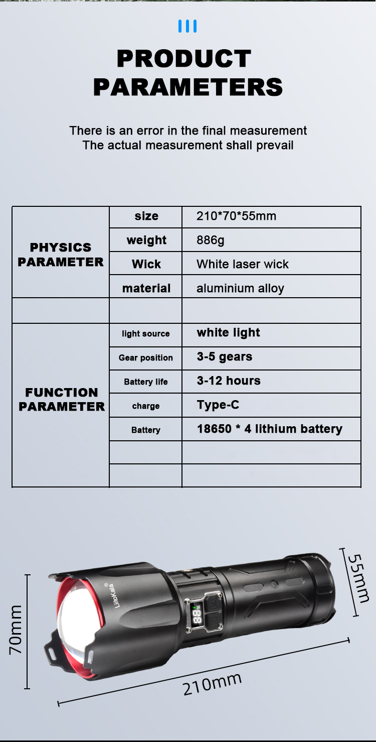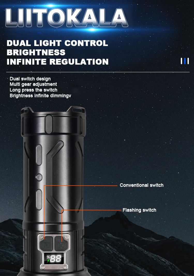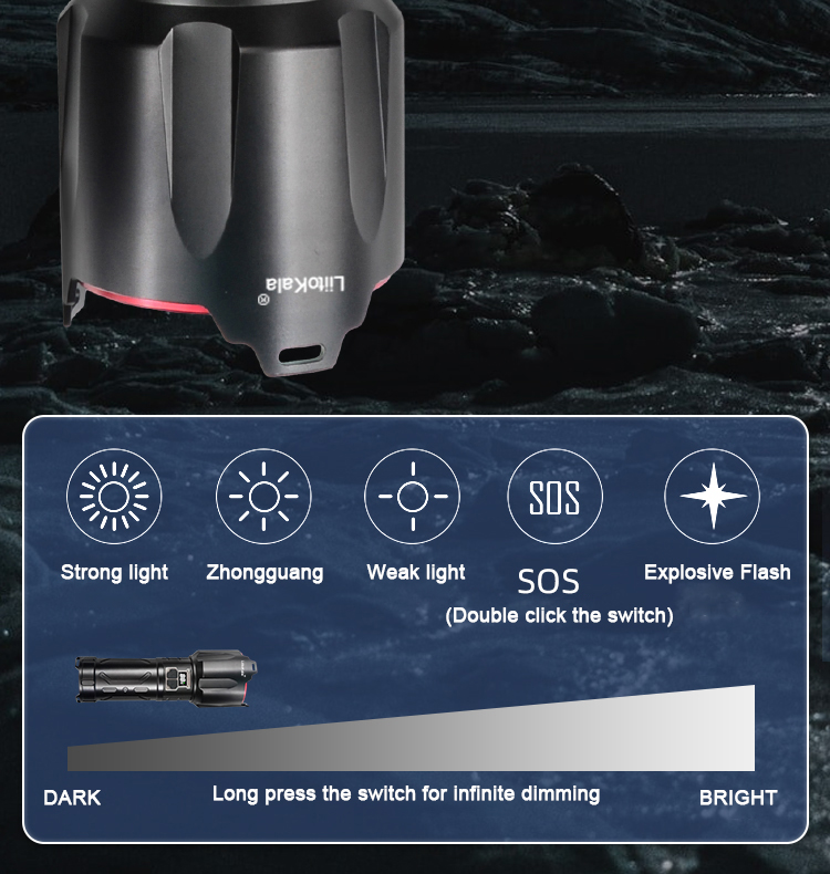 Gear: Three levels Normal/Double click SOS/Flash switch/Long press infinite dimming
