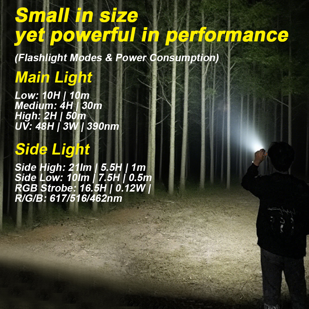 Main Light Source: Low Brightness → Medium Brightness → High Brightness → Strobe → Long Press to Switch to UV Mode